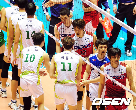 4일 오후 서울 장충체육관에서 열린 '2011-2012 NH농협 V리그' 남자부 드림식스와 KEPCO의 경기 종료 후 선수들이 악수를 나누고 있다.