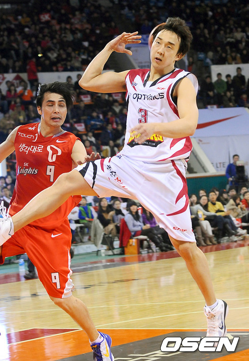 4일 오후 서울 잠실학생체육관서 열린 '2011-2012 KB국민카드 프로농구' 서울 SK와 창원 LG의 경기 3쿼터 LG 김현중이 노룩패스를 시도하고 있다.