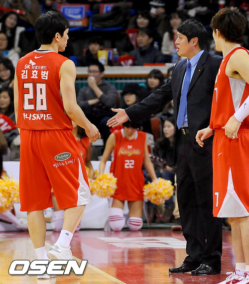 4일 오후 서울 잠실학생체육관서 열린 '2011-2012 KB국민카드 프로농구' 서울 SK와 창원 LG의 경기 3쿼터 작전타임때 SK 문경은 감독이 김효범과 이야기를 나누고 있다.