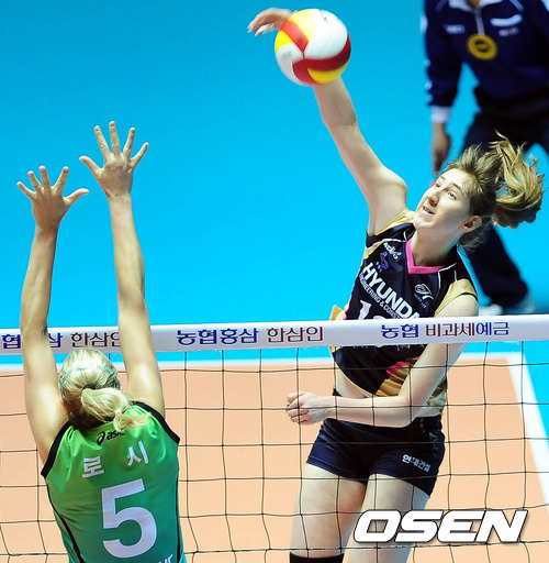 4일 오후 서울 장충체육관에서 열린 '2011-2012 NH농협 V리그' 여자부 GS칼텍스와 현대건설의 경기 1세트 현대건설 브란키차가 공격을 시도하고 있다.