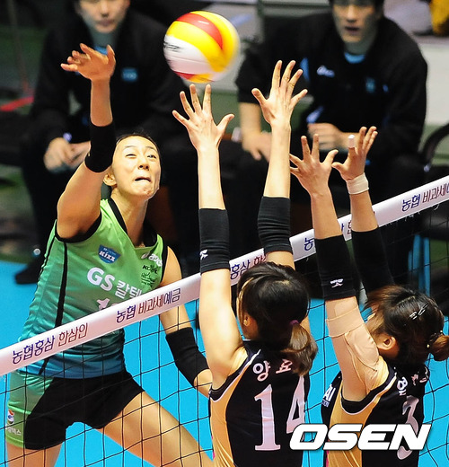 4일 오후 서울 장충체육관에서 열린 '2011-2012 NH농협 V리그' 여자부 GS칼텍스와 현대건설의 경기 2세트 GS칼텍스 한송이가 공격을 시도하고 있다.