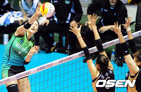 4일 오후 서울 장충체육관에서 열린 '2011-2012 NH농협 V리그' 여자부 GS칼텍스와 현대건설의 경기 2세트 GS칼텍스 김민지가 공격을 시도하고 있다.