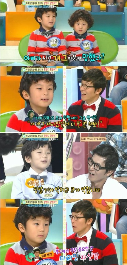 배우 이정용의 아들 믿음군이 아빠가 시킨 개그때문에 망신(?)을 당한 사연을 밝혔다.