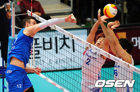 2세트 대한항공 한선수가 삼성화재 가빈의 강타를 블로킹하고 있다.