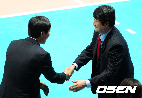 경기전 대한항공 신영철 감독과 삼성화재 신치용 감독이 인사를 하고 있다.