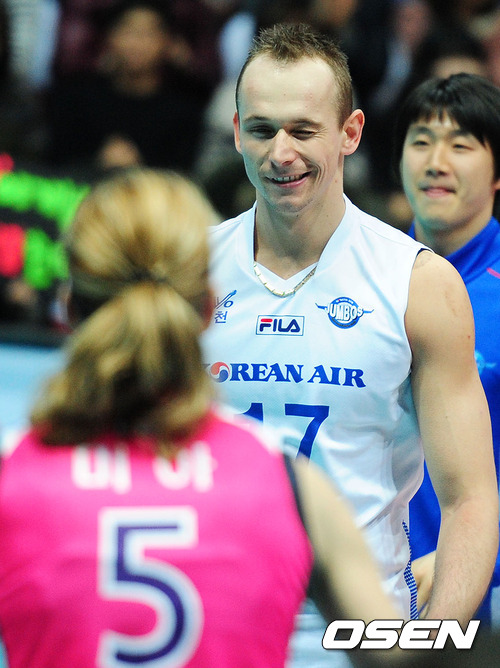 경기후 대한항공 마틴이 흥국생명 마틴을 바라보며 윙크를 하고 있다. /jpnews@osen.co.kr