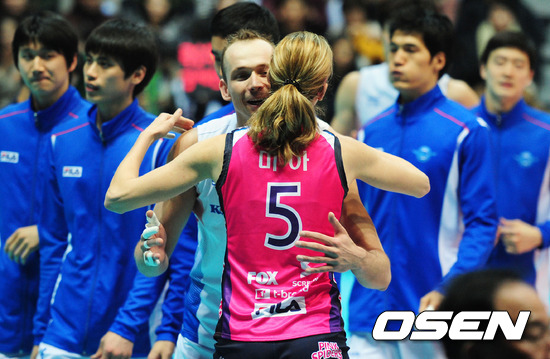 승리를 거둔 대한항공 마틴이 흥국생명 미아와 포옹을 하고 있다. /jpnews@osen.co.kr