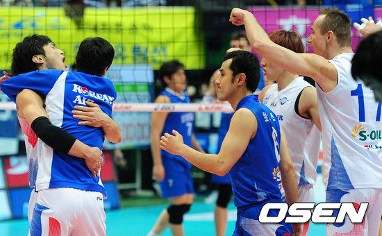 승리를 거둔 대한항공 선수들이 기뻐하고 있다. /jpnews@osen.co.kr