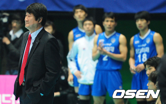 3세트 삼성화재 신치용 감독이 아쉬운 표정으로 경기를 지켜보고 있다. /jpnews@osen.co.kr