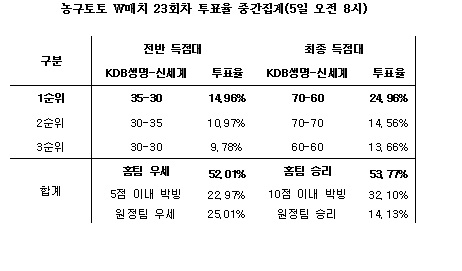 국민체육진흥공단(www.kspo.or.kr)이 발행하는 체육진흥투표권 수탁사업자인 스포츠토토의 공식 온라인 발매 사이트 베트맨(www.betman.co.kr)이 2월 6일(월) 오후 5시 구리시체육관에서 벌어지는 KDB생명-신세계전 대상 농구토토 W매치 23회차 게임 투표율을 중간 집계한 결과, 전체 참가자의 53.77%는 KDB생명이 신세계에 승리할 것으로 예상했다고 밝혔다.