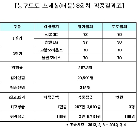 이밖에 1, 2경기의 결과를 알아맞히는 게임(더블)에서는 총 218명의 적중자가 나와 각각 베팅금액의 267.3배의 적중금을 가져가게 됐다.