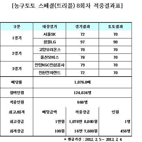 [농구토토] 2011-2012 프로농구 3경기를 대상으로 하는 농구토토 스페셜 8회차 게임(트리플)에서 총 668명의 적중자가 나왔다.