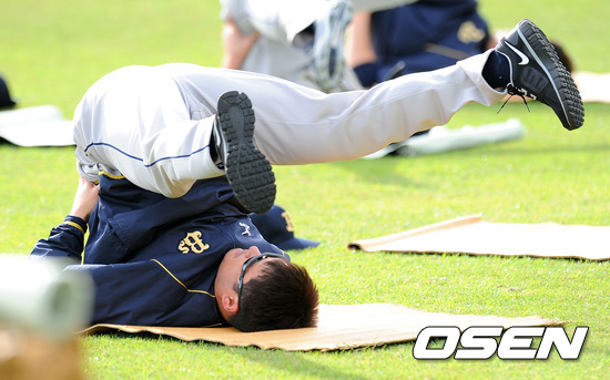 5일 일본 오키나와현 미야코지마 시민구장에서 열린 일본프로야구 버팔로 오릭스의 스프링캠프에서 백차승이 스트레칭 훈련을 하고 있다.