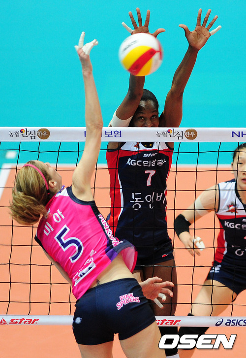 1세트 흥국생명 미아의 강타를 인삼공사 몬타뇨가 블로킹하고 있다. /jpnews@osen.co.kr