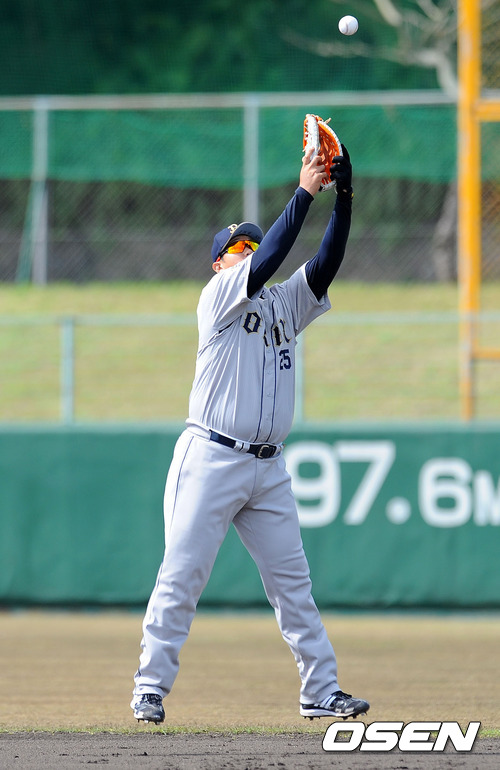 5일 일본 오키나와현 미야코지마 시민구장에서 열린 일본프로야구 버팔로 오릭스의 스프링캠프에서 이대호가 수비 훈련 중 공이 키를 넘어가자 글러브를 벗어 잡으려 하고 있다.