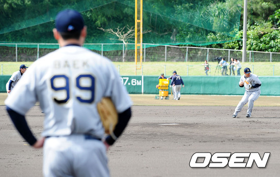 5일 일본 오키나와현 미야코지마 시민구장에서 열린 일본프로야구 버팔로 오릭스의 스프링캠프에서 백차승이 이대호의 수비 훈련을 바라보고 있다.