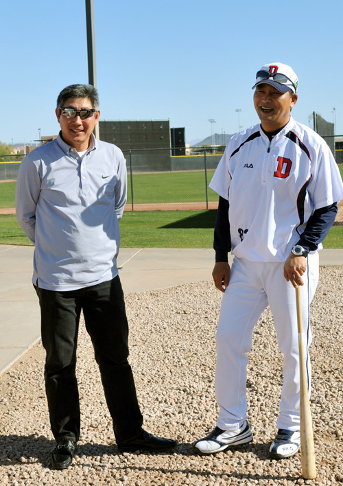 두산 베어스의 미국 애리조나 피오리아 전지훈련에 ‘야왕’이 행차했다. 한대화 한화 이글스 감독이 휴식일을 틈 타 두산 훈련장을 찾아 김진욱 두산 감독을 만나 격려하고 환담을 나눴다.
