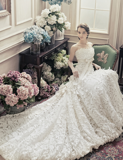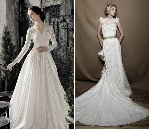 레이스는 로맥틱하고 고풍스러운 분위기를 연출해 주는 것이 가장 큰 매력. 특히 소매 부분이나 네크라인이 레이스로 장식된 스타일이 많다. 이는 굵은 팔을 감추는데도 효과적이라 결혼식 앞두고 다이어트로 스트레스 받을 예비 신부들의 마음을 사로잡을 것으로 보인다.
