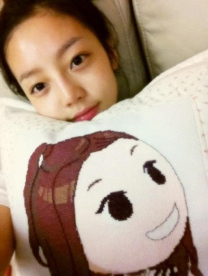 사진 속 구하라는 자신과 닮은 큰 눈을 가진 귀여운 캐릭터가 수놓아진 쿠션을 끌어 안은 모습이다. 특히 화장기가 전혀 없는 얼굴에도 깨끗하고 하얀 피부를 뽐냈다.