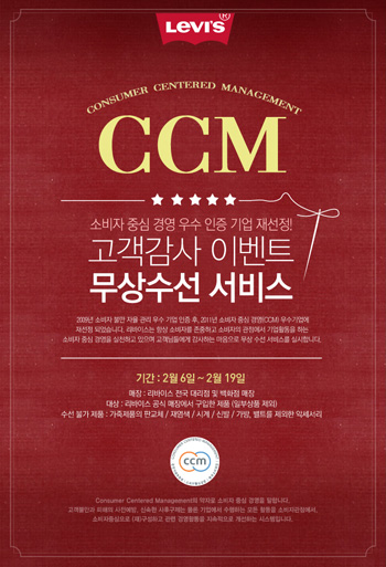 한편, CCM(Consumer Centered Management, 소비자 중심 경영)은 모든 경영활동을 소비자를 중심으로 구성하고 이를 지속적으로 개선하고 있는 지 공정거래위원회에서 평가 및 인증하는 제도로 리바이스는 지난 2009년 패션업계 최초로 CCM을 획득해 화제를 모은 바 있다.