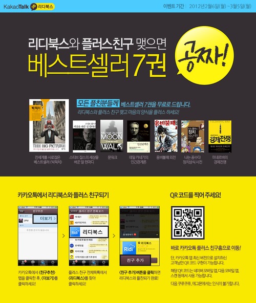 전자책 브랜드 리디북스(www.ridibooks.com/ 대표 배기식)가 ‘카카오톡 플러스 친구’ 서비스를 오픈하고 친구를 맺는 이들에게 스테디 베스트셀러 7권을 3월 5일까지 무료로 제공한다.