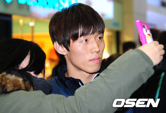 7일 오후 '2012 런던 올림픽 아시아지역 최종예선' A조 사우디아라비아와의 4차전을 마치고 돌아온 올림픽대표팀 김보경이 인천국제공항 입국장에서 한 팬과 사진을 찍고 있다.