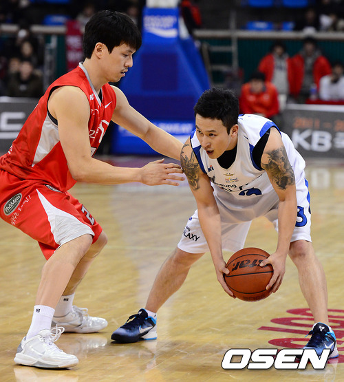 7일 오후 서울 잠실학생체육관에서 열린 2011~2012 프로농구 서울 삼성과 서울 SK의 경기 4쿼터 삼성 김승현이 SK 김효범을 상대로 돌파 시도하고 있다.