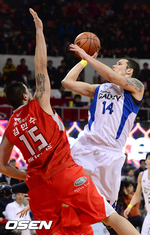 7일 오후 서울 잠실학생체육관에서 열린 2011~2012 프로농구 서울 삼성과 서울 SK의 경기 4쿼터 삼성 김승준이 SK 김민수를 상대로 페이드어웨이슛을 시도하고 있다.