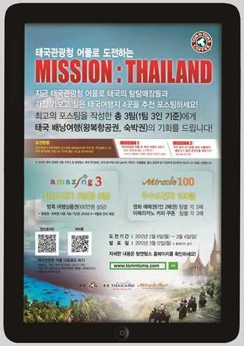 탐앤탐스가 태국관광청과 공동 프로모션으로, 태국 배낭여행을 후원하는 '태국관광청 어플로 도전하는 미션타일랜드' 이벤트를 펼친다.