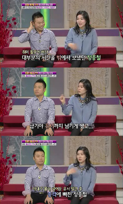 아내의 유서에 놀란 정종철은 "충격이었고 편지 내용은 지금도 떠올리고 싶지 않다"고 악몽 같던 상황을 떠올렸다. 그는 "그 편지를 차안에서 읽었는데 보면서 손이 덜덜 떨렸다"면서 "바로 전화해서 잘못했다고 했고 스케줄과 인간관계를 거의 다 정리한 후 집에만 있었다"고 고백했다.
