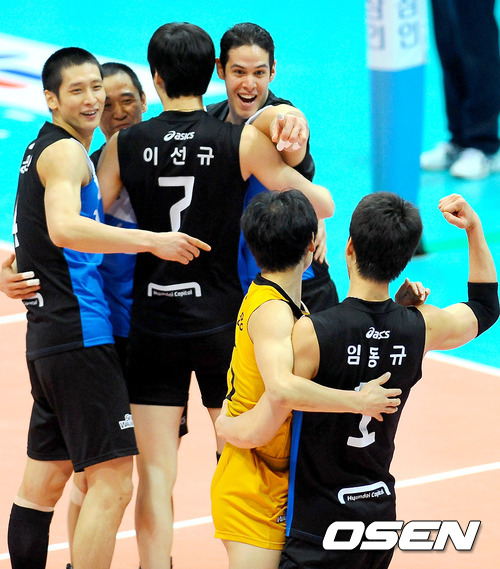 9일 오후 인천 도원체육관에서 열린 '2011~2012시즌 NH 농협 V리그' 남자부 인천 대한항공과 천안 현대캐피탈의 경기 2세트 현대캐파탈 임동규의 득점때 선수들이 환호하고 있다.