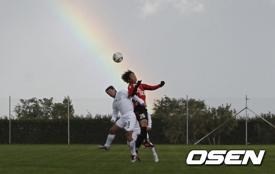 지난 9일(이하 한국시간) 경남 FC가 훈련을 펼치는 사이프러스 라르나카 알파구장에는 비가 내렸다. 한국처럼 강한 소나기가 아닌 해가 떠 있는 상태에서 내리는 '여우비'. 비가 내리면서 하늘에는 무지개가 떴다. 이를 보고 반가워 한 이가 있다.