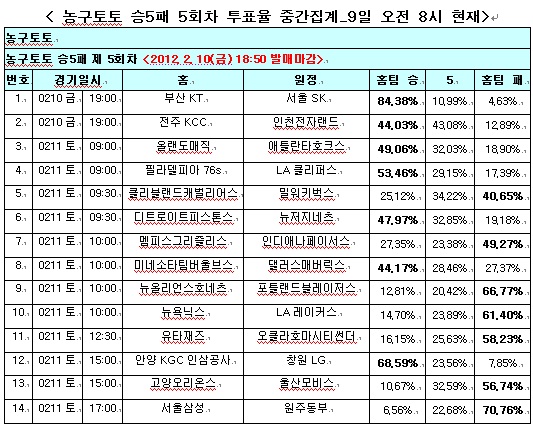 한편, KBL에서는 11일 오후 5시 삼성-동부(14경기)전에서 선두 동부가 승리할 것(70.76%)이라는 전망이 가장 높게 집계됐다. 같은 날 KGC-LG(12경기)전에서는 2위 KGC가 LG에 승리할 것(68.59%)으로 예상됐다. 농구토토 승5패 5회차 게임은 10일 오후 6시 50분에 발매가 마감된다.