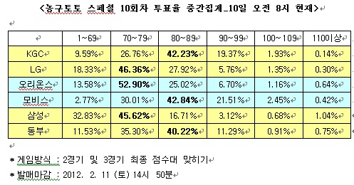 [농구토토] 국민체육진흥공단(www.kspo.or.kr)이 발행하는 체육진흥투표권 수탁사업자인 스포츠토토 공식 온라인 발매 사이트인 베트맨(www.betman.co.kr)은 오는 11일 펼쳐지는 KGC-LG(1경기)전, 오리온스-모비스(2경기)전, 삼성-동부(3경기)전 등 국내 프로농구 3경기를 대상으로 한 농구토토 스페셜 10회차 투표율 중간집계 결과, 참가자들은 3경기 삼성-동부전에서 동부의 승리를 내다봤다.