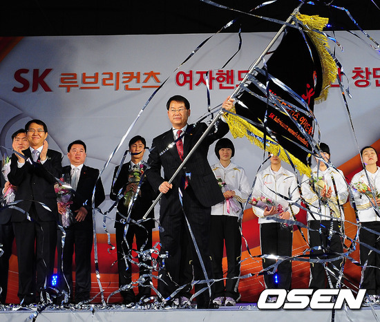10일 오후 서울 올림픽공원 SK핸드볼경기장 보조경기장에서 열린 SK루브리컨츠 핸드볼팀 창단식에서 윤병원 단장이 구단기를 흔들고 있다.