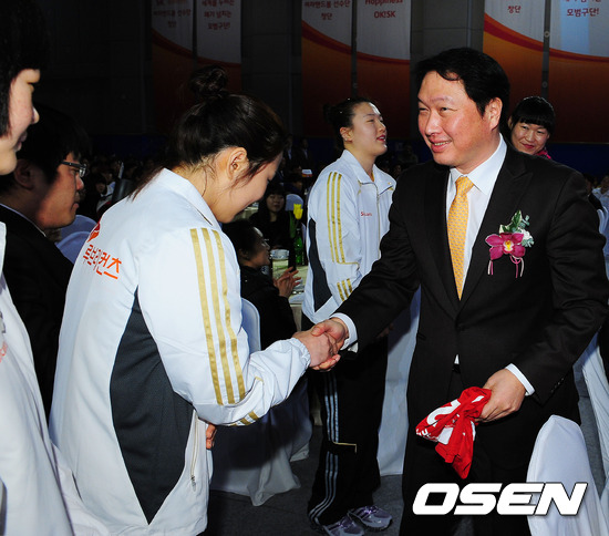 10일 오후 서울 올림픽공원 SK핸드볼경기장 보조경기장에서 열린 SK루브리컨츠 핸드볼팀 창단식에서 최태원 대한핸드볼협회장(SK 그룹 회장)이 선수들과 악수를 나누고 있다.