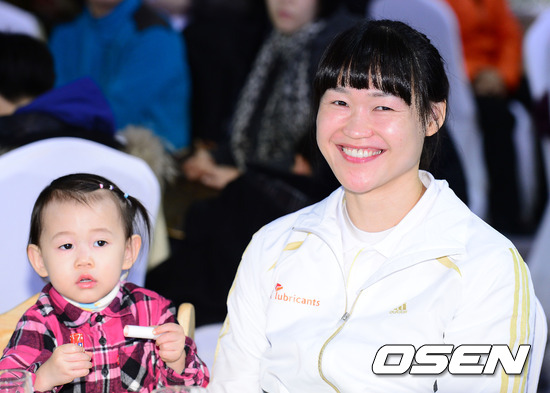 10일 오후 서울 올림픽공원 SK핸드볼경기장 보조경기장에서 열린 SK루브리컨츠 핸드볼팀 창단식에서 김정심 주장이 자신의 딸 옆에서 환하게 미소짓고 있다.