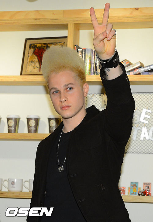 10일 오후 서울 강남구 역삼동의 한 카페에서 열린 ‘슈퍼스타K 3’ 출신 크리스 고라이트리 주최 기자회견에서 크리스가 브이 사인을 보내며 사랑해요 코리아라고 말을 하고 있다.