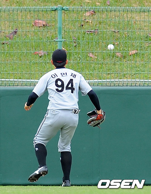 11일 일본 오키나와 차탄 구장에서 열린 LG 트윈스와 주니치 드래건스의 경기, 1회말 1사 LG 이민재가 주니치 후지이의 담장을 넘어간 홈런 타구를 바라보고 있다.