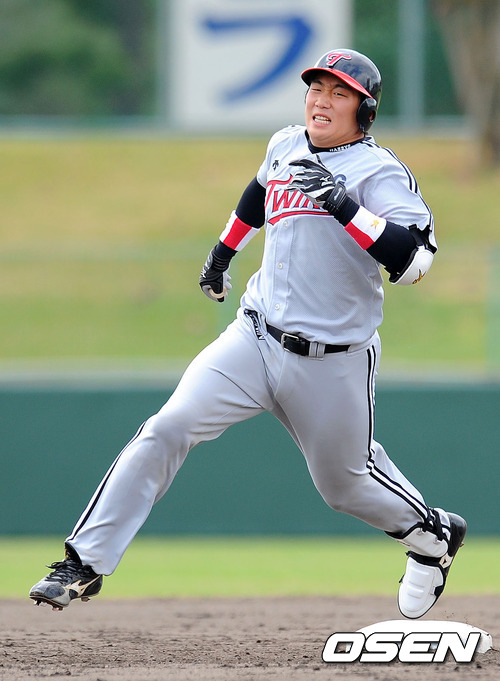 11일 일본 오키나와 차탄 구장에서 열린 LG 트윈스와 주니치 드래건스의 경기, 5회초 1사에서 LG 나성용이 좌측 펜스에 맞는 안타를 치고 2루를 지나 3루까지 힘차게 달리고 있다.