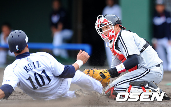 11일 일본 오키나와 차탄 구장에서 열린 LG 트윈스와 주니치 드래건스의 경기, 5회말 무사 주니치 50의 좌전 안타때 LG 나성용이 1루 주자 루이즈를 아웃처리하고 있다.