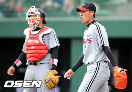 11일 일본 오키나와 차탄 구장에서 열린 LG 트윈스와 주니치 드래건스의 경기, 5회말 2사 1,2루에서 주니치 도노우에에게 적시타를 허용한 LG 이대환이 아쉬운 표정을 지으며 마운드로 가고 있다.
