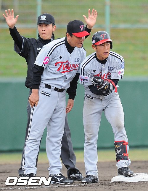 11일 일본 오키나와 차탄 구장에서 열린 LG 트윈스와 주니치 드래건스의 경기, 7회초 무사 2루에서 LG 정주현이 1타점 적시타를 치고 송구홍 코치와 이야기를 하고 있다.