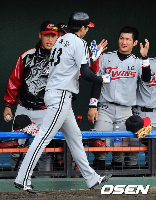 11일 일본 오키나와 차탄 구장에서 열린 LG 트윈스와 주니치 드래건스의 경기, 7회초 무사 2루에서 LG 정주현의 1타점 적시타때 홈을 밟은 2루주자 윤정우가 덕아웃에서 동료들과 하이파이브를 하고 있다.