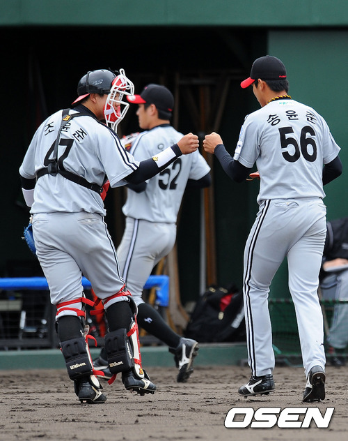 11일 일본 오키나와 차탄 구장에서 열린 LG 트윈스와 주니치 드래건스의 경기, 7회말 2사 1루 주니치 다카시마 쇼헤이를 삼진 처리한 LG 송윤준이 조윤준과 하이파이브를 하고 있다.