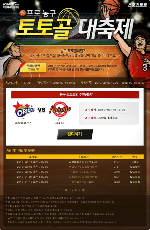 '토토골'의 주인공을 정확히 맞힌 농구팬 가운데 추첨을 통해 총 50명에게 프로농구 자신이 원하는 구단의 홈경기를 관전할 수 있는 경기예매권(1인 2매)을 경품으로 지급한다.