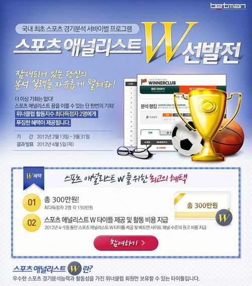 국민체육진흥공단이 발행하는 체육진흥투표권 수탁사업자 스포츠토토의 공식 발매사이트 베트맨(www.betman.co.kr)이 '스포츠 애널리스트 W 선발전'이라는 이름으로 스포츠 경기분석 서바이벌 이벤트를 개최한다.