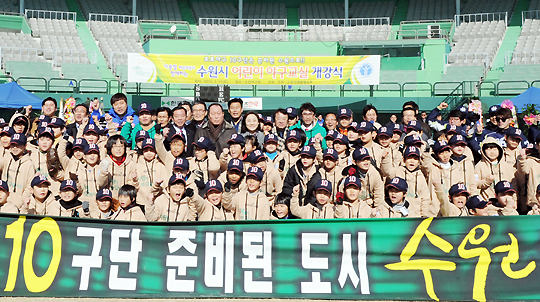 수원시는 지난해부터 초등학생 3~6학년을 대상으로 회원을 모집해 11일 수원구장에서 염태영 수원시장을 비롯해 김인식 감독, 양준혁 야구스타등 많은 야구관계자가 참석한 가운데 개강식을 개최하고 본격적인 프로그램 운영에 들어갔다.