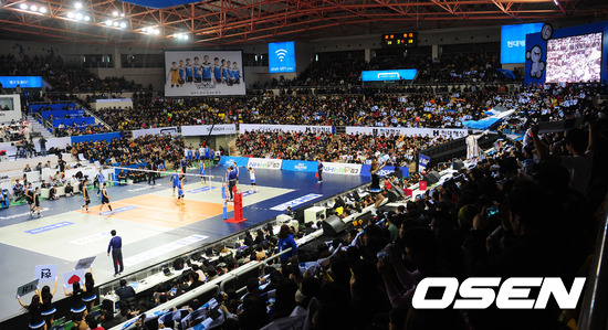 천안 유관순체육관에 매진을 기록하며 수많은 관중들이 경기를 관전하고 있다.