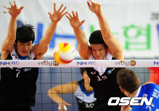1세트 현대캐피탈 수니아스가 삼성화재 가빈을 블로킹으로 막아내고 있다./jpnews@osen.co.kr